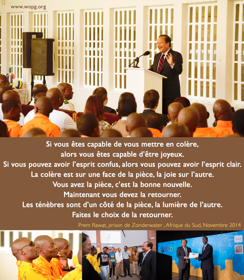 Si vous êtes capable de vous mettre en colère, alors vous êtes capable d’être joyeux. Si vous pouvez avoir l’esprit confus, alors vous pouvez avoir l’esprit clair. La colère est sur une face de la pièce, la joie, sur l’autre. Vous avez la pièce, c’est la bonne nouvelle. Maintenant vous devez la retourner. Les ténèbres sont d’un côté de la pièce, la lumière de l’autre. Faites le choix de la retourner.
