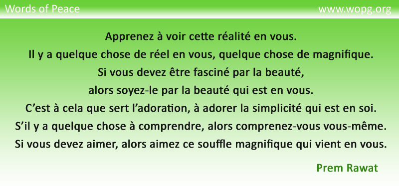 Apprenez à voir cette réalité en vous. Il y a quelque chose de réel en vous, quelque chose de magnifique. Si vous devez être fasciné par la beauté, alors soyez-le par la beauté qui est en vous. C’est à cela que sert l’adoration, à adorer la simplicité qui est en soi. S’il y a quelque chose à comprendre, alors comprenez-vous vous-même. Si vous devez aimer, alors aimez ce souffle magnifique qui vient en vous.