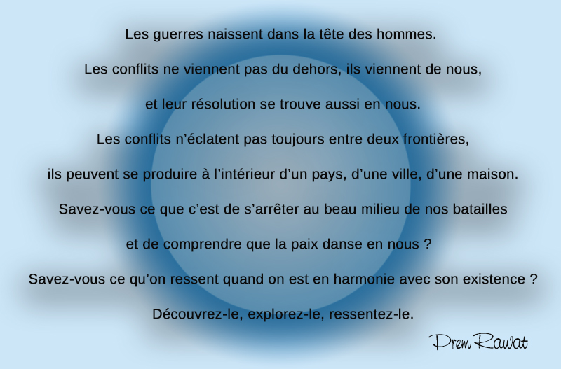Les guerres naissent dans la tête des hommes. Les conflits ne viennent pas du dehors, ils viennent de nous, et leur résolution se trouve aussi en nous. Les conflits n’éclatent pas toujours entre deux frontières, ils peuvent se produire à l’intérieur d’un pays, d’une ville, d’une maison. Savez-vous ce que c’est de s’arrêter au beau milieu de nos batailles et de comprendre que la paix danse en nous ? Savez-vous ce qu’on ressent quand on est en harmonie avec son existence ? Découvrez-le, explorez-le, ressentez-le.