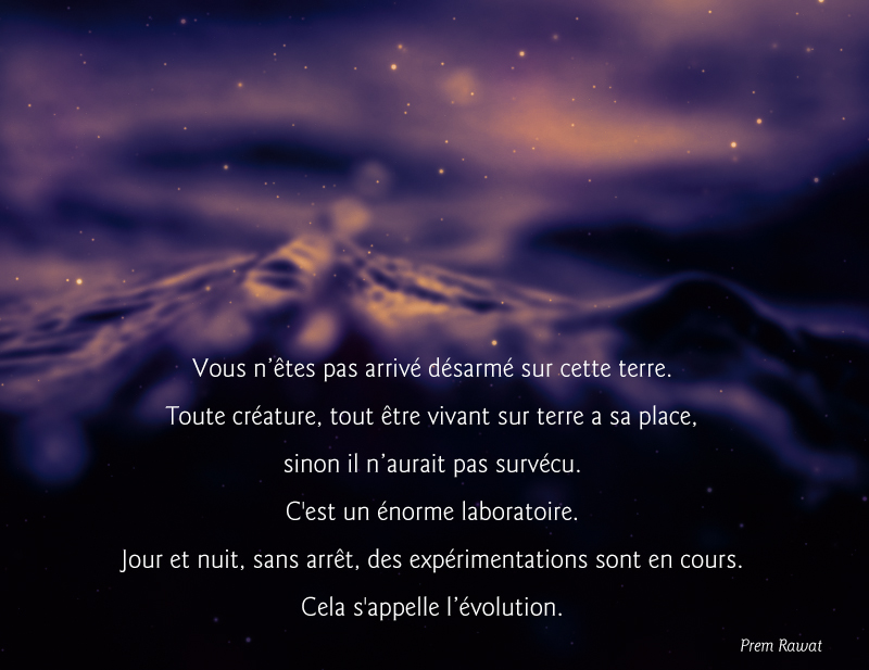 Vous n’êtes pas arrivé désarmé sur cette terre. Toute créature, tout être vivant sur terre a sa place, sinon il n’aurait pas survécu. C'est un énorme laboratoire. Jour et nuit, sans arrêt, des expérimentations sont en cours. Cela s'appelle l’évolution.