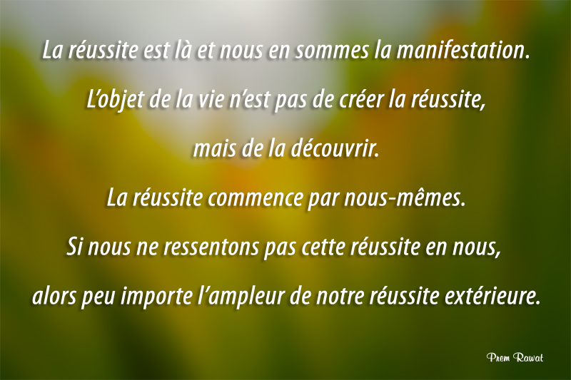 La réussite est là et nous en sommes la manifestation. L’objet de la vie n’est pas de créer la réussite, mais de la découvrir. La réussite commence par nous-mêmes. Si nous ne ressentons pas cette réussite en nous, alors peu importe l’ampleur de notre réussite extérieure.