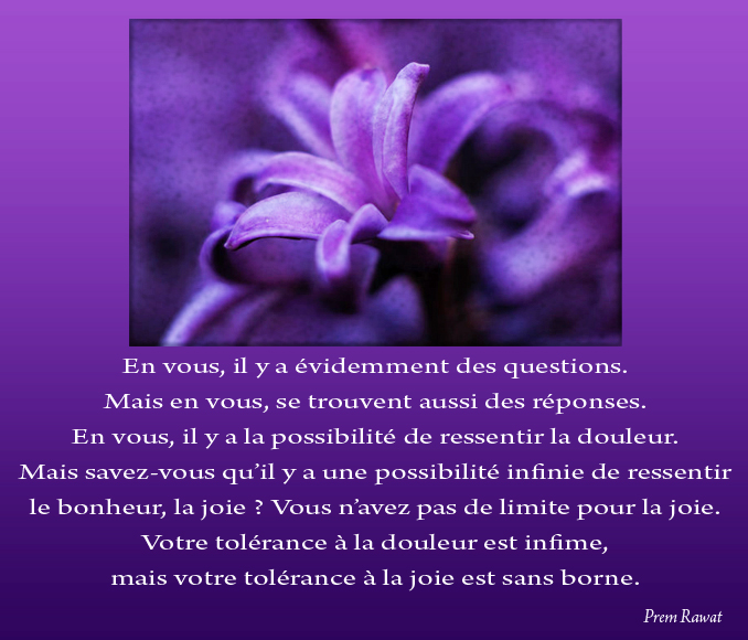 En vous, il y a évidemment des questions. Mais en vous, se trouvent aussi des réponses. En vous, il y a la possibilité de ressentir la douleur. Mais savez-vous qu'il y a une possibilité infinie de ressentir le bonheur, la joie ? Vous n'avez pas de limite pour la joie. Votre tolérance à la douleur est infime, mais votre tolérance à la joie est sans borne.