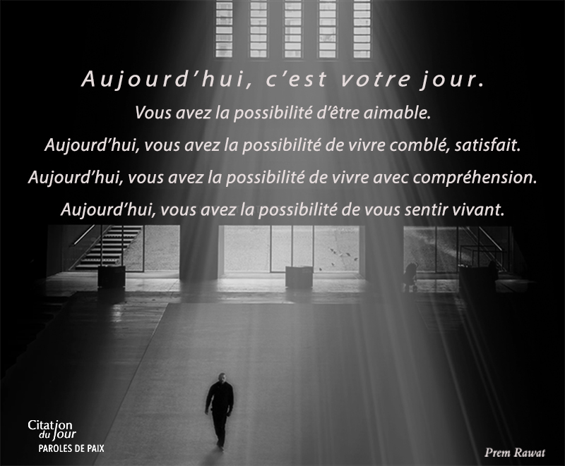 Aujourd’hui, c’est votre jour. Vous avez la possibilité d’être aimable. Aujourd’hui, vous avez la possibilité de vivre comblé, satisfait. Aujourd’hui, vous avez la possibilité de vivre avec compréhension. Aujourd’hui, vous avez la possibilité de vous sentir vivant.