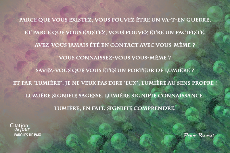 Parce que vous existez, vous pouvez être un va-t-en guerre, et parce que vous existez, vous pouvez être un pacifiste. Avez-vous jamais été en contact avec vous-même ? Vous connaissez-vous vous-même ? Savez-vous que vous êtes un porteur de lumière ? Et par “lumière”, je ne veux pas dire “lux”, lumière au sens propre ! Lumière signifie sagesse. Lumière signifie connaissance. Lumière, en fait, signifie comprendre.