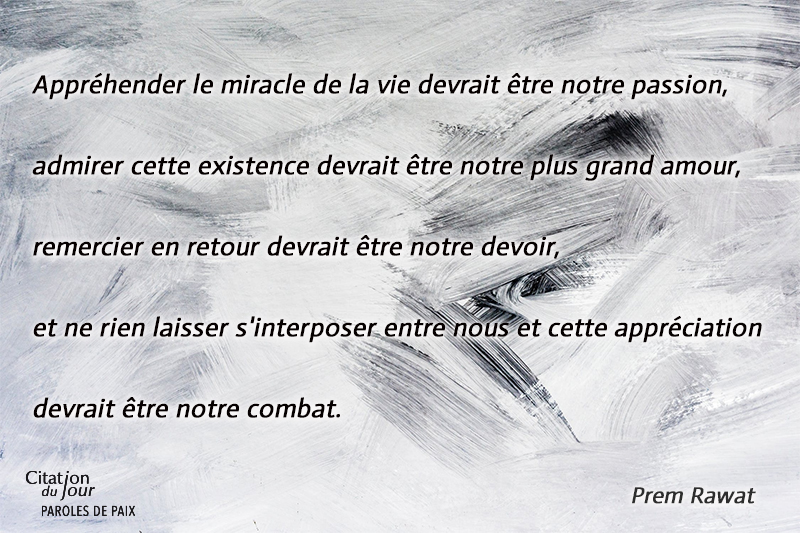 Appréhender le miracle de la vie devrait être notre passion, admirer cette existence devrait être notre plus grand amour, remercier en retour devrait être notre devoir, et ne rien laisser s'interposer entre nous et cette appréciation devrait être notre combat.