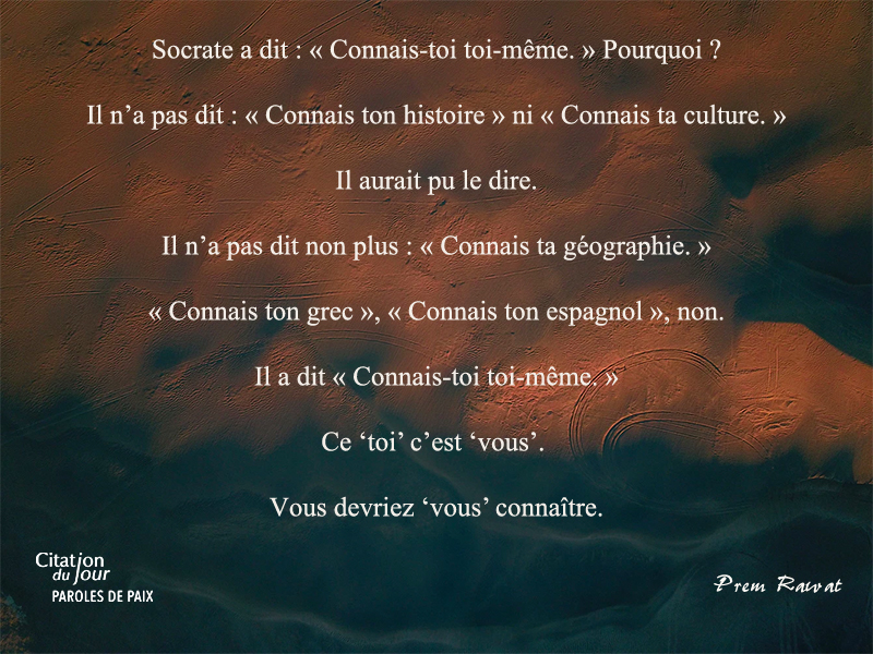 Socrate a dit : « Connais-toi toi-même. » Pourquoi ? Il n’a pas dit : « Connais ton histoire » ni « Connais ta culture. » Il aurait pu le dire. Il n’a pas dit non plus : « Connais ta géographie. » « Connais ton grec », « Connais ton espagnol », non. Il a dit « Connais-toi toi-même. » Ce ‘toi’ c’est ‘vous’. Vous devriez ‘vous’ connaître.