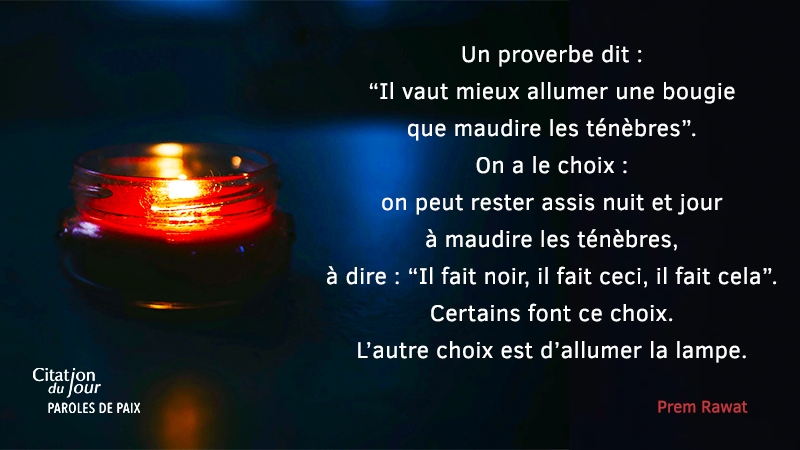Un proverbe dit : “Il vaut mieux allumer une bougie que maudire les ténèbres”. On a le choix : on peut rester assis nuit et jour à maudire les ténèbres, à dire : “Il fait noir, il fait ceci, il fait cela”. Certains font ce choix. L’autre choix est d’allumer la lampe.