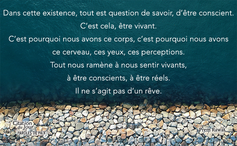 Dans cette existence, tout est question de savoir, d’être conscient. C’est cela, être vivant. C’est pourquoi nous avons ce corps, c’est pourquoi nous avons ce cerveau, ces yeux, ces perceptions. Tout nous ramène à nous sentir vivants, à être conscients, à être réels. Il ne s’agit pas d’un rêve.
