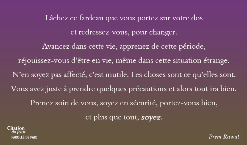Lâchez ce fardeau que vous portez sur votre dos et redressez-vous, pour changer. Avancez dans cette vie, apprenez de cette période, réjouissez-vous d’être en vie, même dans cette situation étrange. N’en soyez pas affecté, c’est inutile. Les choses sont ce qu’elles sont. Vous avez juste à prendre quelques précautions et alors tout ira bien. Prenez soin de vous, soyez en sécurité, portez-vous bien, et plus que tout, soyez.