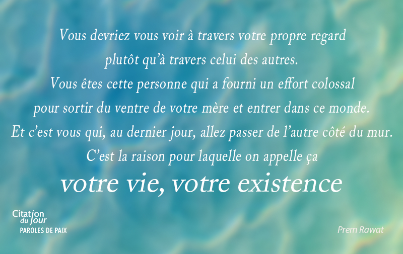 Vous devriez vous voir à travers votre propre regard plutôt qu’à travers celui des autres. Vous êtes cette personne qui a fourni un effort colossal pour sortir du ventre de votre mère et entrer dans ce monde. Et c’est vous qui, au dernier jour de votre vie, allez passer de l’autre côté du mur. C’est la raison pour laquelle on appelle ça votre vie, votre existence.