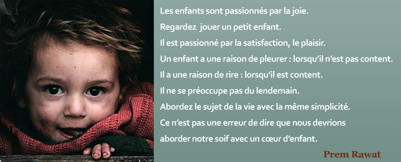 Les enfants sont passionnés par la joie. Regardez jouer un petit enfant. Il est passionné par la satisfaction, le plaisir. Un enfant a une raison de pleurer : lorsqu’il n’est pas content. Il a une raison de rire : lorsqu’il est content. Il ne se préoccupe pas du lendemain. Abordez le sujet de la vie avec la même simplicité. Ce n’est pas une erreur de dire que nous devrions aborder notre soif avec un cœur d’enfant.