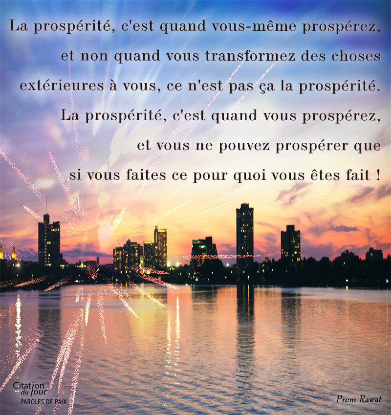 La prospérité, c'est quand vous-même prospérez, et non quand vous transformez des choses extérieures à vous, ce n'est pas ça la prospérité. La prospérité, c'est quand vous prospérez, et vous ne pouvez prospérer que si vous faites ce pour quoi vous êtes fait !