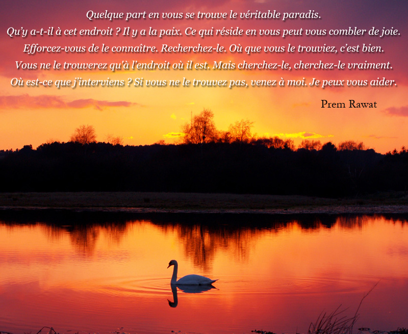 Quelque part en vous se trouve le véritable paradis. Qu’y a-t-il à cet endroit ? Il y a la paix. Ce qui réside en vous peut vous combler de joie. Efforcez-vous de le connaître. Recherchez-le. Où que vous le trouviez, c’est bien. Vous ne le trouverez qu'à l’endroit où il est. Mais cherchez-le, cherchez-le vraiment. Où est-ce que j’interviens ? Si vous ne le trouvez pas, venez à moi. Je peux vous aider.