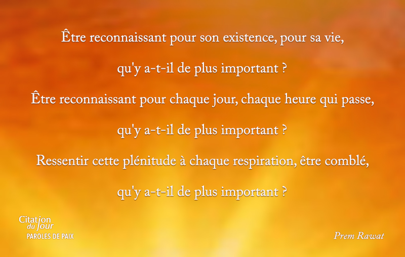 Être reconnaissant pour son existence, pour sa vie, qu'y a-t-il de plus important ? Être reconnaissant pour chaque jour, chaque heure qui passe, qu'y a-t-il de plus important ? Ressentir cette plénitude à chaque respiration, être comblé, qu'y a-t-il de plus important ?