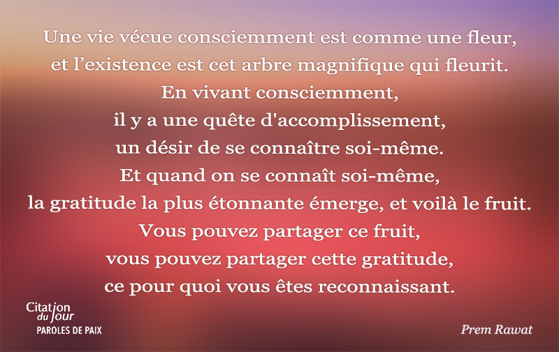 Une vie vécue consciemment est comme une fleur, et l’existence est cet arbre magnifique qui fleurit. En vivant consciemment, il y a une quête d'accomplissement, un désir de se connaître soi-même. Et quand on se connaît soi-même, la gratitude la plus étonnante émerge, et voilà le fruit. Vous pouvez partager ce fruit, vous pouvez partager cette gratitude, ce pour quoi vous êtes reconnaissant.