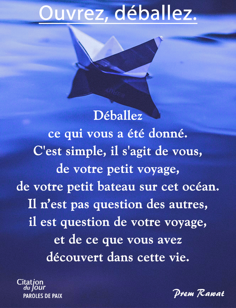 Ouvrez, déballez ce qui vous a été donné. C'est simple, il s'agit de vous, de votre petit voyage, de votre petit bateau sur cet océan. Il n’est pas question des autres, il est question de votre voyage, et de ce que vous avez découvert dans cette vie.