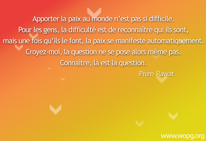 Apporter la paix au monde n’est pas si difficile. Pour les gens, la difficulté est de reconnaître qui ils sont, mais une fois qu’ils le font, la paix se manifeste automatiquement. Croyez-moi, la question ne se pose alors même pas. Connaître, là est la question.