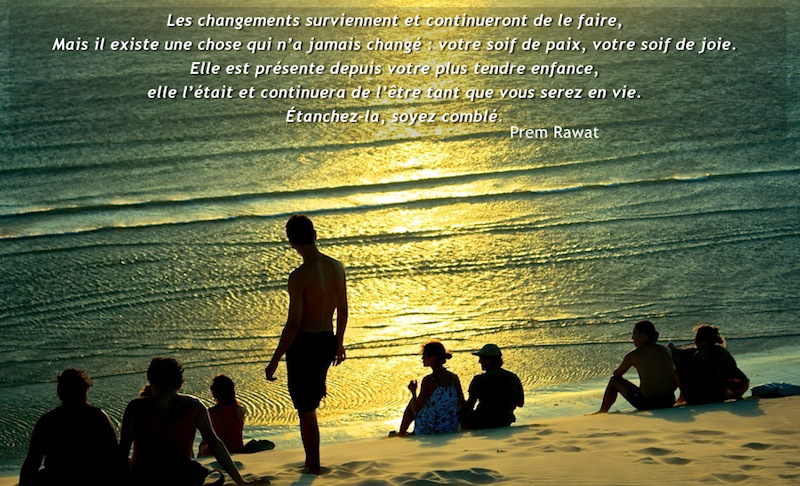 Les changements surviennent et continueront de le faire, Mais il existe une chose qui n’a jamais changé : votre soif de paix, votre soif de joie. Elle est présente depuis votre plus tendre enfance, elle l’était et continuera de l’être tant que vous serez en vie. Étanchez-la, soyez comblé.