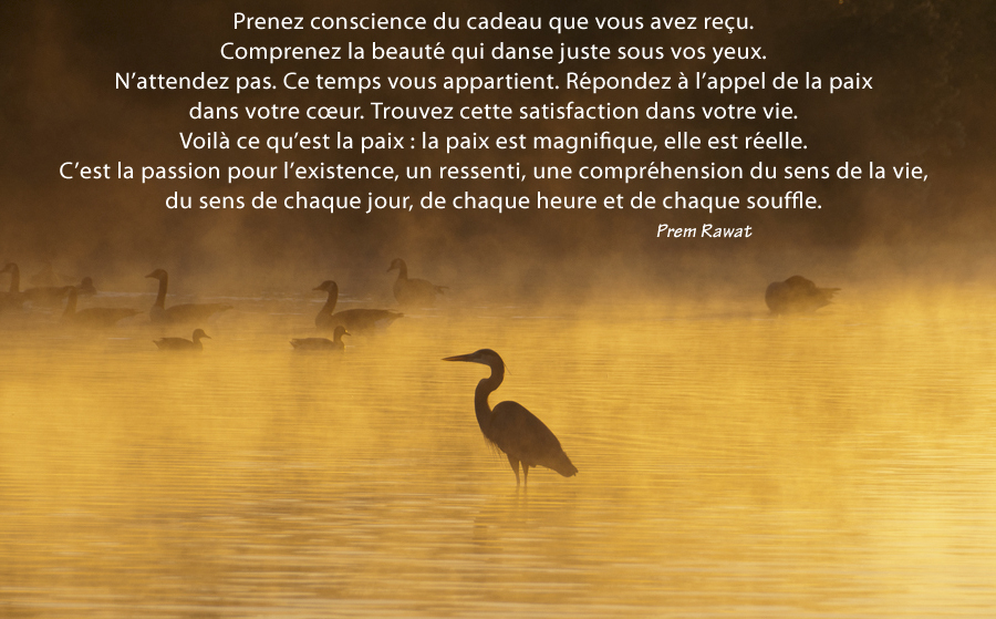 Prenez conscience du cadeau que vous avez reçu. Comprenez la beauté qui danse juste sous vos yeux. N’attendez pas. Ce temps vous appartient. Répondez à l’appel de la paix dans votre cœur. Trouvez cette satisfaction dans votre vie. Voilà ce qu’est la paix : la paix est magnifique, elle est réelle. C’est la passion pour l’existence, un ressenti, une compréhension du sens de la vie, du sens de chaque jour, de chaque heure et de chaque souffle.