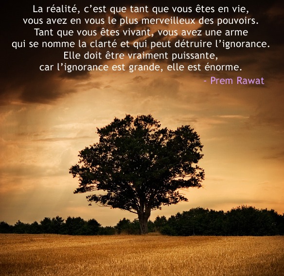 La réalité, c’est que tant que vous êtes en vie, vous avez en vous le plus merveilleux des pouvoirs. Tant que vous êtes vivant, vous avez une arme qui se nomme la clarté et qui peut détruire l’ignorance. Elle doit être vraiment puissante, car l’ignorance est grande, elle est énorme.