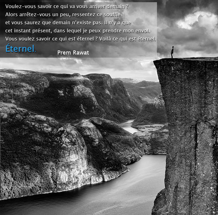 Voulez-vous savoir ce qui va vous arriver demain ? Alors arrêtez-vous un peu, ressentez ce souffle et vous saurez que demain n’existe pas. Il n’y a que cet instant présent, dans lequel je peux prendre mon envol. Vous voulez savoir ce qui est éternel ? Voilà ce qui est éternel. Éternel.