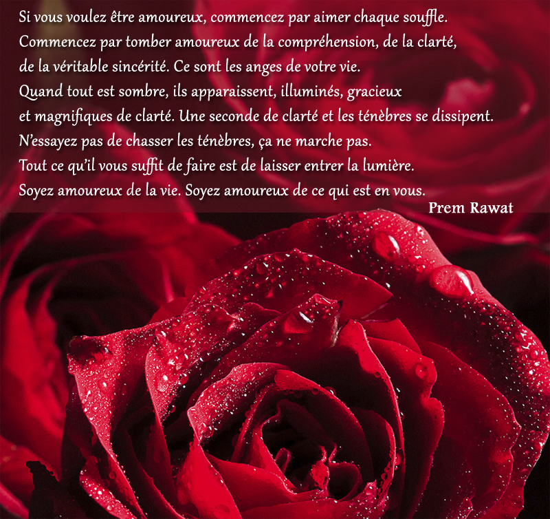 Si vous voulez être amoureux, commencez par aimer chaque souffle. Commencez par tomber amoureux de la compréhension, de la clarté, de la véritable sincérité. Ce sont les anges de votre vie. Quand tout est sombre, ils apparaissent, illuminés, gracieux et magnifiques de clarté. Une seconde de clarté et les ténèbres se dissipent. N’essayez pas de chasser les ténèbres, ça ne marche pas. Tout ce qu’il vous suffit de faire est de laisser entrer la lumière. Soyez amoureux de la vie. Soyez amoureux de ce qui est en vous.