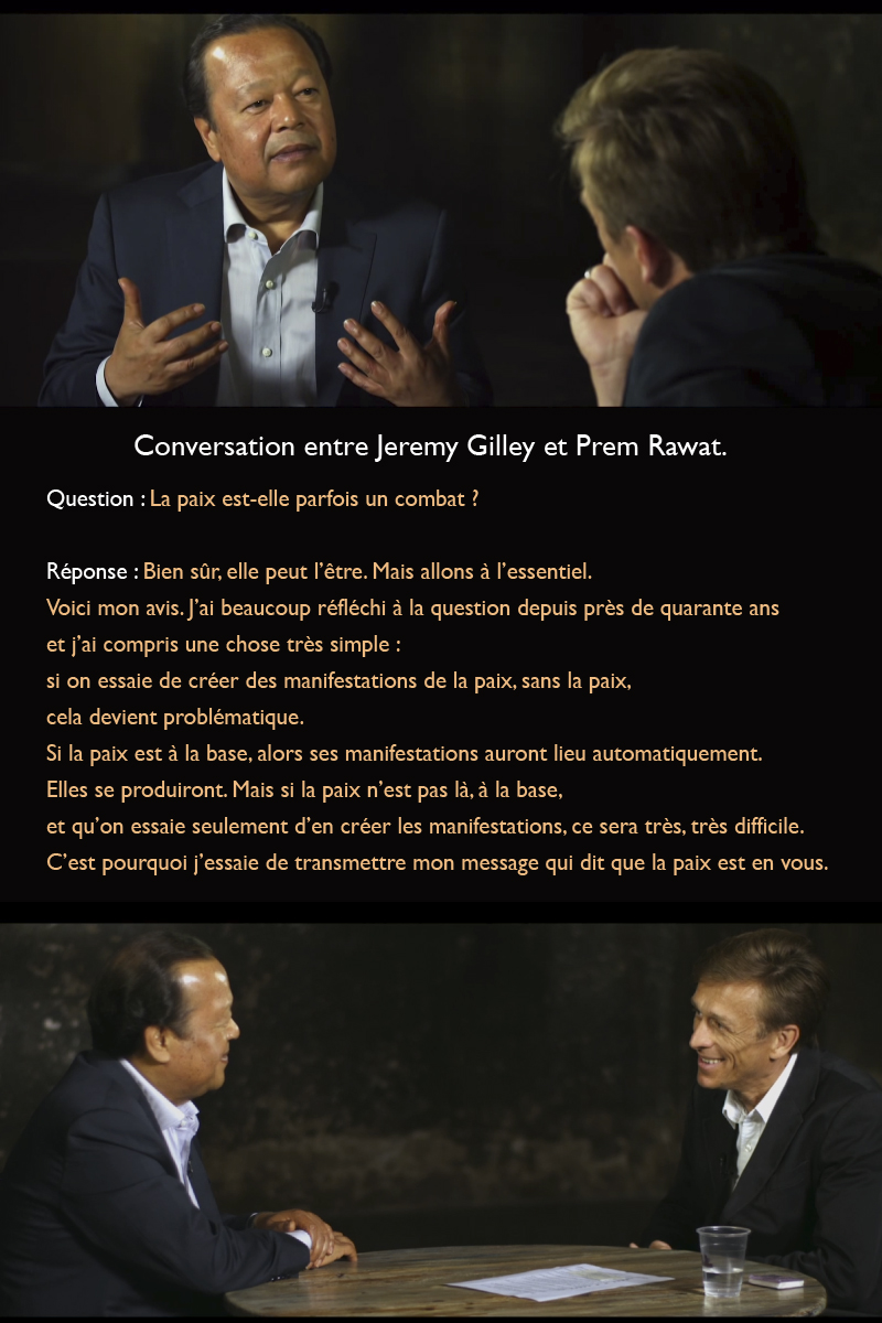 Réponse : Bien sûr, elle peut l'être. Mais allons à l’essentiel. Voici mon avis. J’ai beaucoup réfléchi à la question depuis près de quarante ans et j’ai compris une chose très simple : si on essaie de créer des manifestations de la paix, sans la paix, cela devient problématique. Si la paix est à la base, alors ses manifestations auront lieu automatiquement. Elles se produiront. Mais si la paix n’est pas là, à la base, et qu’on essaie seulement d’en créer les manifestations, ce sera très, très difficile. C’est pourquoi j’essaie de transmettre mon message qui dit que la paix est en vous.