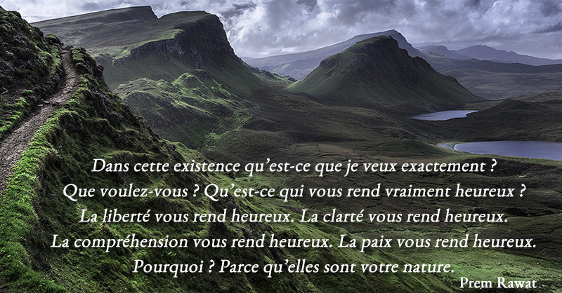 Dans cette existence qu’est-ce que je veux exactement ? Que voulez-vous ? Qu’est-ce qui vous rend vraiment heureux ? La liberté vous rend heureux. La clarté vous rend heureux. La compréhension vous rend heureux. La paix vous rend heureux. Pourquoi ? Parce qu’elles sont votre nature.