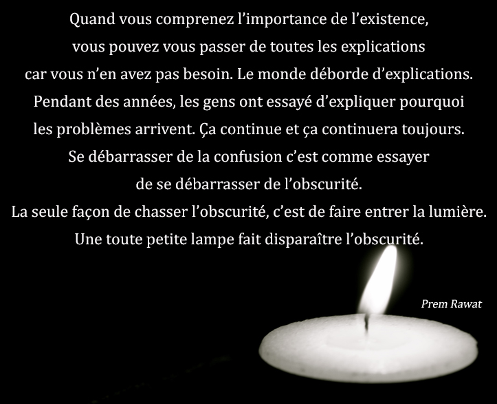 Quand vous comprenez l’importance de l’existence, vous pouvez vous passer de toutes les explications car vous n’en avez pas besoin. Le monde déborde d’explications. Pendant des années, les gens ont essayé d’expliquer pourquoi les problèmes arrivent. Ça continue et ça continuera toujours. Se débarrasser de la confusion c’est comme essayer de se débarrasser de l’obscurité. La seule façon de chasser l’obscurité, c’est de faire entrer la lumière. Une toute petite lampe fait disparaître l’obscurité.