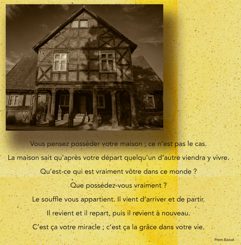 Vous pensez posséder votre maison ; ce n’est pas le cas. La maison sait qu’après votre départ quelqu’un d’autre viendra y vivre. Qu’est-ce qui est vraiment vôtre dans ce monde ? Que possédez-vous vraiment ? Le souffle vous appartient. Il vient d’arriver et de partir. Il revient et il repart, puis il revient à nouveau. C’est ça votre miracle ; c’est ça la grâce dans votre vie.