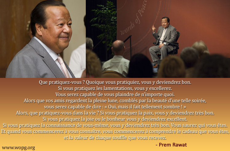 Que pratiquez-vous ? Quoique vous pratiquiez, vous y deviendrez bon. Si vous pratiquez les lamentations, vous y excellerez. Vous serez capable de vous plaindre de n’importe quoi. Alors que vos amis regardent la pleine lune, comblés par la beauté d’une telle soirée, vous serez capable de dire : « Oui, mais il fait tellement sombre ! » Alors, que pratiquez-vous dans la vie ? Si vous pratiquez la paix, vous y deviendrez très bon. Si vous pratiquez la joie ou le bonheur vous y deviendrez excellent. Si vous pratiquez la connaissance de vous-même, vous y deviendrez très bon. Vous saurez qui vous êtes. Et quand vous commencerez à vous connaître, vous commencerez à comprendre le cadeau que vous êtes, et la valeur de chaque souffle que vous recevez.