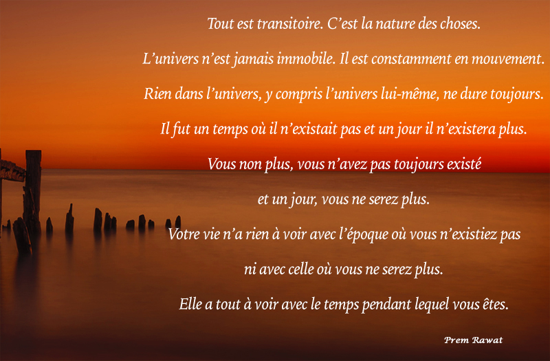 Tout est transitoire. C’est la nature des choses. L’univers n’est jamais immobile. Il est constamment en mouvement. Rien dans l’univers, y compris l’univers lui-même, ne dure toujours. Il fut un temps où il n’existait pas et un jour il n’existera plus. Vous non plus, vous n’avez pas toujours existé et un jour, vous ne serez plus. Votre vie n’a rien à voir avec l’époque où vous n’existiez pas ni avec celle où vous ne serez plus. Elle a tout à voir avec le temps pendant lequel vous êtes.