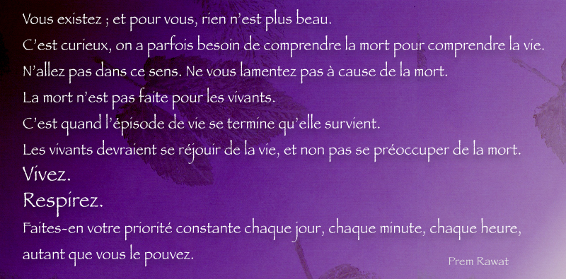 Vous existez ; et pour vous, rien n’est plus beau. C’est curieux, on a parfois besoin de comprendre la mort pour comprendre la vie. N’allez pas dans ce sens. Ne vous lamentez pas à cause de la mort. La mort n’est pas faite pour les vivants. C’est quand l’épisode de vie se termine qu’elle survient. Les vivants devraient se réjouir de la vie, et non pas se préoccuper de la mort. Vivez. Respirez. Faites-en votre priorité constante chaque jour, chaque minute, chaque heure, autant que vous le pouvez.