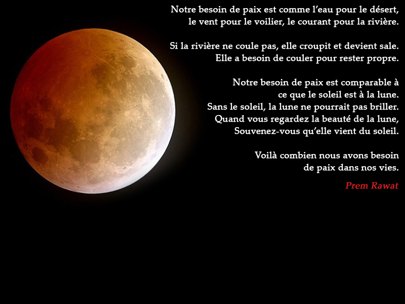 Notre besoin de paix est comme l’eau pour le désert, le vent pour le voilier, le courant pour la rivière. Si la rivière ne coule pas, elle croupit et devient sale. Elle a besoin de couler pour rester propre. Notre besoin de paix est comparable à ce que le soleil est à la lune. Sans le soleil, la lune ne pourrait pas briller. Quand vous regardez la beauté de la lune, Souvenez-vous qu’elle vient du soleil. Voilà combien nous avons besoin de paix dans nos vies.
