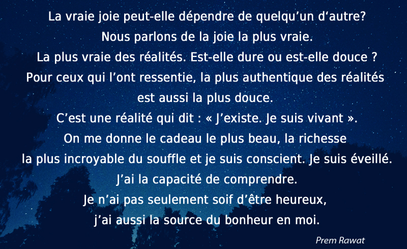 La vraie joie peut-elle dépendre de quelqu’un d‘autre? Nous parlons de la joie la plus vraie. La plus vraie des réalités. Est-elle dure ou est-elle douce ? Pour ceux qui l’ont ressentie, la plus authentique des réalités est aussi la plus douce. C’est une réalité qui dit : « J’existe. Je suis vivant. » On me donne le cadeau le plus beau, la richesse la plus incroyable du souffle et je suis conscient. Je suis éveillé. J’ai la capacité de comprendre. Je n’ai pas seulement soif d’être heureux, j’ai aussi la source du bonheur en moi.