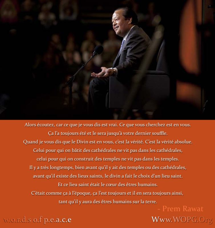 Alors écoutez, car ce que je vous dis est vrai. Ce que vous cherchez est en vous. Ça l’a toujours été et le sera toujours jusqu’à votre dernier souffle. Quand je vous dis que le Divin est en vous, c’est la vérité. C’est la vérité absolue. Celui pour qui on bâtit des cathédrales ne vit pas dans des cathédrales, celui pour qui on construit des temples ne vit pas dans des temples. Il y a très longtemps, bien avant qu’il y ait des temples ou des cathédrales, avant qu’il existe des lieux saints, le divin a fait le choix d’un lieu saint, et ce lieu saint était le cœur des êtres humains. C’était ainsi, ça l’est toujours et ce sera toujours ainsi, tant qu’il y aura des êtres humains sur la terre.
