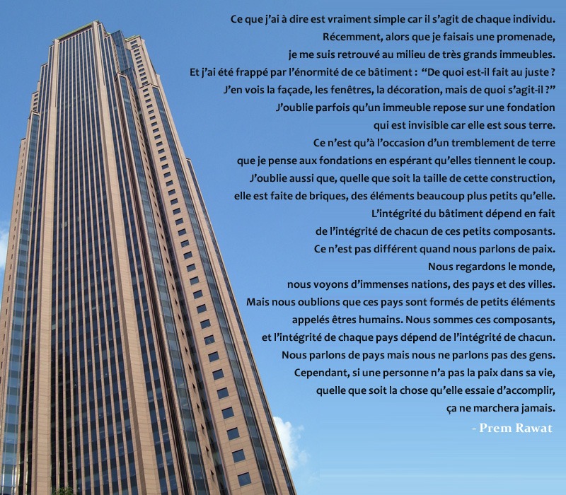 Ce que j’ai à dire est vraiment simple car il s’agit de chaque individu. Récemment, alors que je faisais une promenade, je me suis retrouvé au milieu de très grands immeubles. Et j’ai été frappé par l’énormité de ce bâtiment : “De quoi est-il fait au juste ? J’en vois la façade, les fenêtres, la décoration, mais de quoi s’agit-il ?” J’oublie parfois qu’un immeuble repose sur une fondation qui est invisible car elle est sous terre. Ce n’est qu’à l’occasion d’un tremblement de terre que je pense aux fondations en espérant qu’elles tiennent le coup. J’oublie aussi que, quelle que soit la taille de cette construction, elle est faite de briques, des éléments beaucoup plus petits qu’elle. L’intégrité du bâtiment dépend en fait de l’intégrité de chacun de ces petits composants. Ce n’est pas différent quand nous parlons de paix. Nous regardons le monde, nous voyons d’immenses nations, des pays et des villes. Mais nous oublions que ces pays sont formés de petits éléments appelés êtres humains. Nous sommes ces composants, et l’intégrité de chaque pays dépend de l’intégrité de chacun. Nous parlons de pays mais nous ne parlons pas des gens. Cependant, si une personne n’a pas la paix dans sa vie, quelle que soit la chose qu’elle essaie d’accomplir, ça ne marchera jamais.