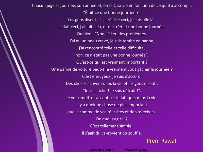 Chacun juge sa journée, son année et, en fait, sa vie en fonction de ce qu’il a accompli. “Était-ce une bonne journée ?” Les gens disent : “J’ai réalisé ceci, je suis allé là, j’ai fait ceci, j’ai fait cela, et oui, c’était une bonne journée”. Ou bien : “Non, j’ai eu des problèmes. J’ai eu un pneu crevé, je suis tombé en panne, j’ai rencontré telle et telle difficulté, non, ce n’était pas une bonne journée”. Qu’est-ce qui est vraiment important ? Une panne de voiture peut-elle vraiment vous gâcher la journée ? C’est ennuyeux, je suis d’accord. Des choses arrivent dans la vie et les gens disent : “Je suis fichu ! Je suis détruit !”. Je veux mettre l’accent sur le fait, que dans la vie, il y a quelque chose de plus important que la somme de vos réussites et de vos échecs. De quoi s’agit-il ? C’est tellement simple. Il s’agit du va-et-vient du souffle.