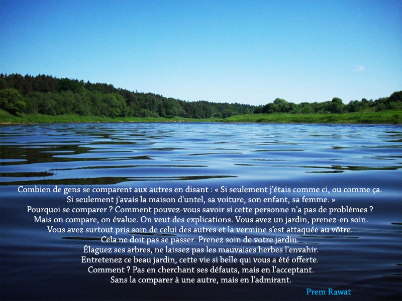 Combien de gens se comparent aux autres en disant : « Si seulement j'étais comme ci, ou comme ça. Si seulement j'avais la maison d'untel, sa voiture, son enfant, sa femme. » Pourquoi se comparer ? Comment pouvez-vous savoir si cette personne n'a pas de problèmes ? Mais on compare, on évalue. On veut des explications. Vous avez un jardin, prenez-en soin. Vous avez surtout pris soin de celui des autres et la vermine s’est attaquée au vôtre. Cela ne doit pas se passer. Prenez soin de votre jardin. Élaguez ses arbres, ne laissez pas les mauvaises herbes l'envahir. Entretenez ce beau jardin, cette vie si belle qui vous a été offerte. Comment ? Pas en cherchant ses défauts, mais en l'acceptant. Sans la comparer à une autre, mais en l'admirant.