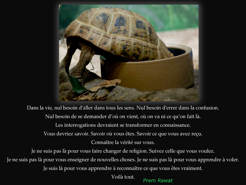 Dans la vie, nul besoin d’aller dans tous les sens. Nul besoin d’errer dans la confusion. Nul besoin de se demander d’où on vient, où on va ni ce qu’on fait là. Les interrogations devraient se transformer en connaissance. Vous devriez savoir. Savoir où vous êtes. Savoir ce que vous avez reçu. Connaître la vérité sur vous. Je ne suis pas là pour vous faire changer de religion. Suivez celle que vous voulez. Je ne suis pas là pour vous enseigner de nouvelles choses. Je ne suis pas là pour vous apprendre à voler. Je suis là pour vous apprendre à reconnaître ce que vous êtes vraiment. Voilà tout.