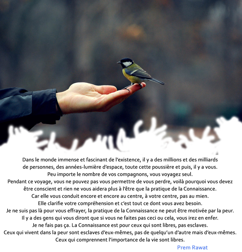 Dans le monde immense et fascinant de l’existence, il y a des millions et des milliards de personnes, des années-lumière d’espace, toute cette poussière et puis, il y a vous. Peu importe le nombre de vos compagnons, vous voyagez seul. Pendant ce voyage, vous ne pouvez pas vous permettre de vous perdre, voilà pourquoi vous devez être conscient et rien ne vous aidera plus à l’être que la pratique de la Connaissance. Car elle vous conduit encore et encore au centre, à votre centre, pas au mien. Elle clarifie votre compréhension et c’est tout ce dont vous avez besoin. Je ne suis pas là pour vous effrayer, la pratique de la Connaissance ne peut être motivée par la peur. Il y a des gens qui vous diront que si vous ne faites pas ceci ou cela, vous irez en enfer. Je ne fais pas ça. La Connaissance est pour ceux qui sont libres, pas esclaves. Ceux qui vivent dans la peur sont esclaves d’eux-mêmes, pas de quelqu’un d’autre mais d’eux-mêmes. Ceux qui comprennent l’importance de la vie sont libres.
