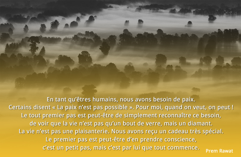 En tant qu’êtres humains, nous avons besoin de paix. Certains disent « La paix n’est pas possible ». Pour moi, quand on veut, on peut ! Le tout premier pas est peut-être de simplement reconnaître ce besoin, de voir que la vie n’est pas qu’un bout de verre, mais un diamant. La vie n’est pas une plaisanterie. Nous avons reçu un cadeau très spécial. Le premier pas est peut-être d’en prendre conscience, c’est un petit pas, mais c’est par lui que tout commence.