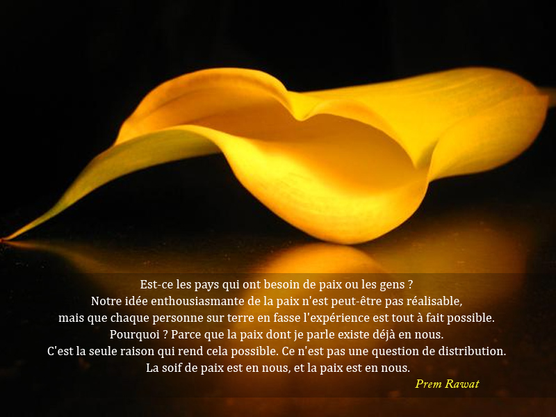 Est-ce les pays qui ont besoin de paix ou les gens ? Notre idée enthousiasmante de la paix n'est peut-être pas réalisable, mais que chaque personne sur terre en fasse l'expérience est tout à fait possible. Pourquoi ? Parce que la paix dont je parle existe déjà en nous. C'est la seule raison qui rend cela possible. Ce n'est pas une question de distribution. La soif de paix est en nous, et la paix est en nous.