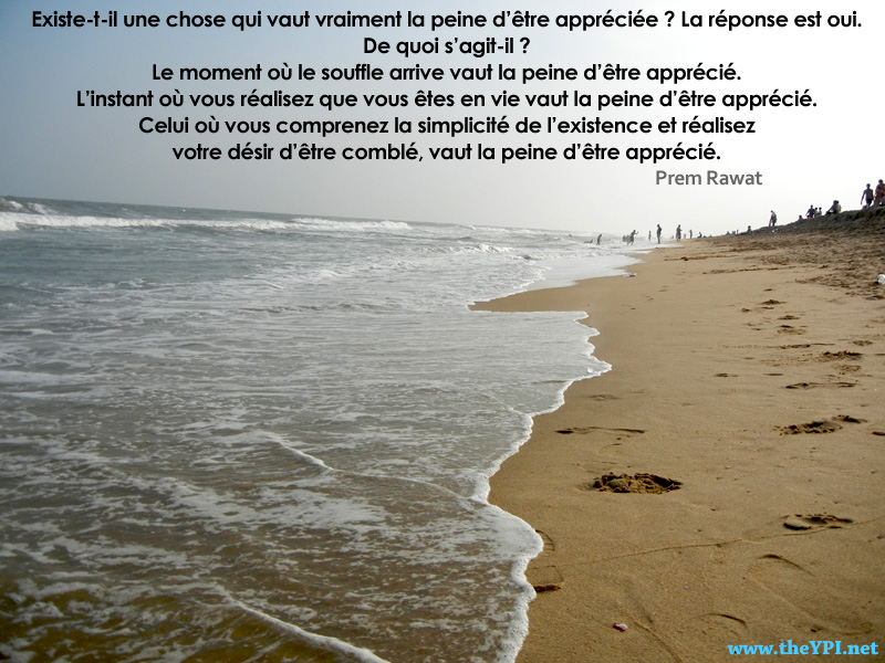 Existe-t-il une chose qui vaut vraiment la peine d’être appréciée ? La réponse est oui. De quoi s’agit-il ? Le moment où le souffle arrive vaut la peine d’être apprécié. L’instant où vous réalisez que vous êtes en vie vaut la peine d’être apprécié. Celui où vous comprenez la simplicité de l’existence et réalisez votre désir d’être comblé, vaut la peine d’être apprécié.