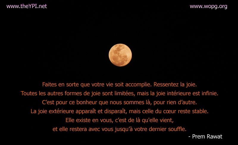Faites en sorte que votre vie soit accomplie. Ressentez la joie. Toutes les autres formes de joie sont limitées, mais la joie intérieure est infinie. C’est pour ce bonheur que nous sommes là, pour rien d’autre. La joie extérieure apparaît et disparaît, mais celle du cœur reste stable. Elle existe en vous, c’est de là qu'elle vient, et elle restera avec vous jusqu’à votre dernier souffle.