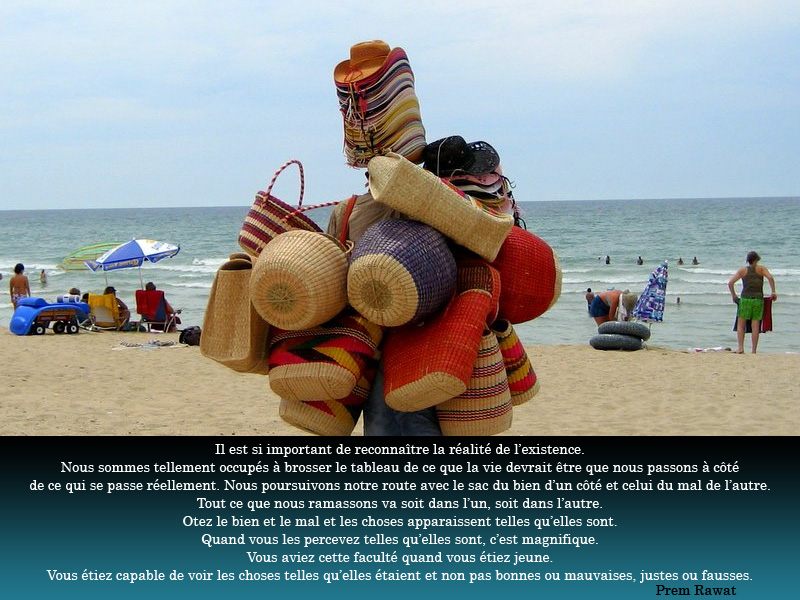 Il est si important de reconnaître la réalité de l’existence. Nous sommes tellement occupés à brosser le tableau de ce que la vie devrait être que nous passons à côté de ce qui se passe réellement. Nous poursuivons notre route avec le sac du bien d’un côté et celui du mal de l’autre. Tout ce que nous ramassons va soit dans l’un, soit dans l’autre. Otez le bien et le mal et les choses apparaissent telles qu’elles sont. Quand vous les percevez telles qu’elles sont, c’est magnifique. Vous aviez cette faculté quand vous étiez jeune. Vous étiez capable de voir les choses telles qu’elles étaient et non pas bonnes ou mauvaises, justes ou fausses.