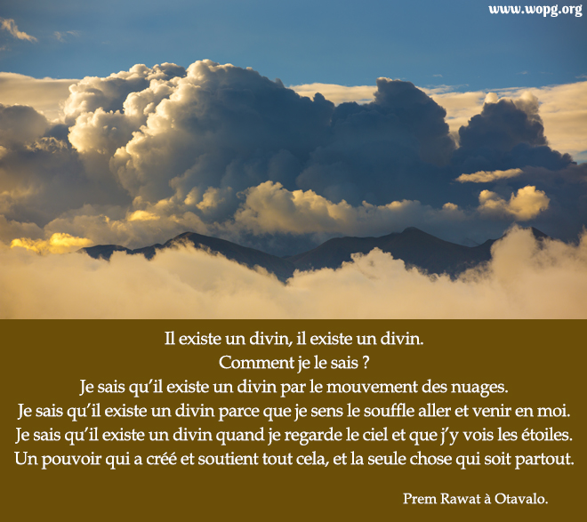 Il existe un divin, il existe un divin. Comment je le sais ? Je sais qu’il existe un divin par le mouvement des nuages. Je sais qu’il existe un divin parce que je sens le souffle aller et venir en moi. Je sais qu’il existe un divin quand je regarde le ciel et que j’y vois les étoiles. Un pouvoir qui a créé et soutient tout cela, et la seule chose qui soit partout.