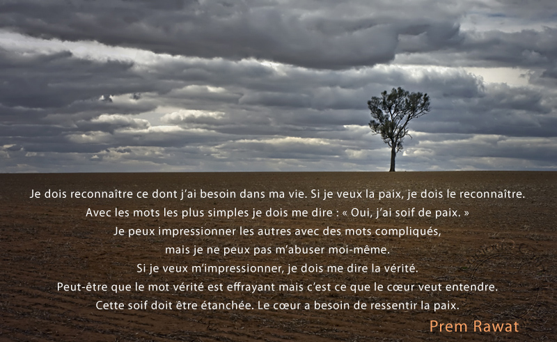 Je dois reconnaître ce dont j’ai besoin dans ma vie. Si je veux la paix, je dois le reconnaître. Avec les mots les plus simples je dois me dire : « Oui, j’ai soif de paix. » Je peux impressionner les autres avec des mots compliqués, mais je ne peux pas m’abuser moi-même. Si je veux m’impressionner, je dois me dire la vérité. Peut-être que le mot vérité est effrayant mais c’est ce que le cœur veut entendre. Cette soif doit être étanchée. Le cœur a besoin de ressentir la paix.
