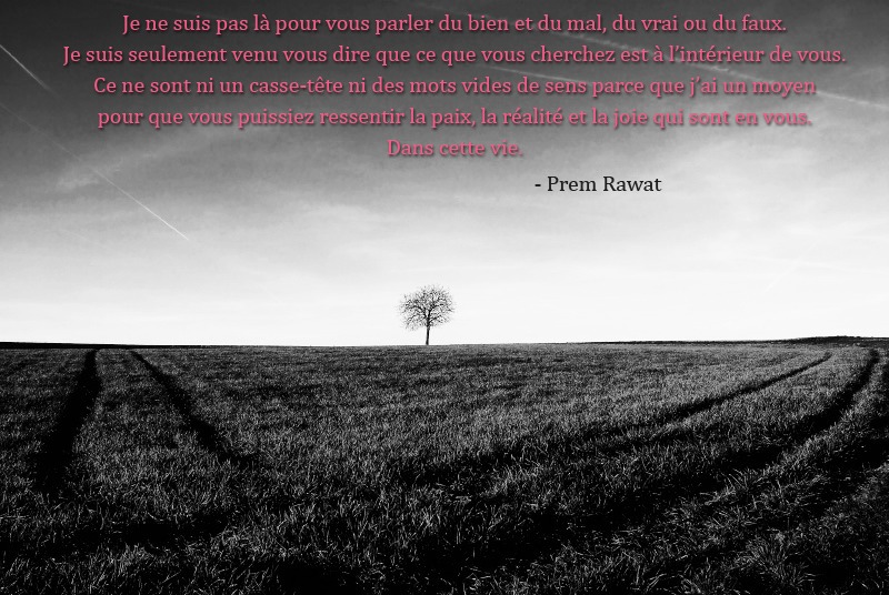 Je ne suis pas là pour vous parler du bien et du mal, du vrai ou du faux. Je suis seulement venu vous dire que ce que vous cherchez est à l’intérieur de vous. Ce ne sont ni un casse-tête ni des mots vides de sens parce que j’ai un moyen pour que vous puissiez ressentir la paix, la réalité et la joie qui sont en vous. Dans cette vie.