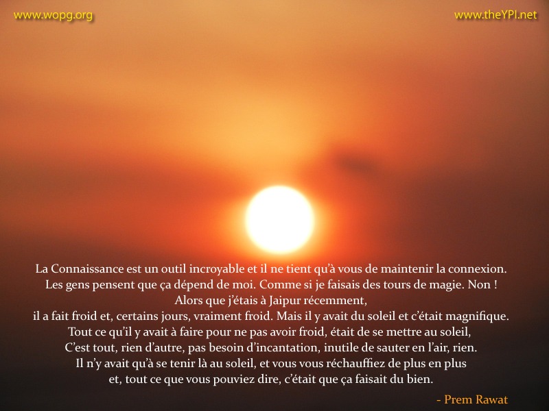 La Connaissance est un outil incroyable et il ne tient qu’à vous de maintenir la connexion. Les gens pensent que ça dépend de moi. Comme si je faisais des tours de magie. Non ! Alors que j’étais à Jaipur récemment, il a fait froid et, certains jours, vraiment froid. Mais il y avait du soleil et c’était magnifique. Tout ce qu’il y avait à faire pour ne pas avoir froid, était de se mettre au soleil, C’est tout, rien d’autre, pas besoin d’incantation, inutile de sauter en l’air, rien. Il n’y avait qu’à se tenir là au soleil, et vous vous réchauffiez de plus en plus et, tout ce que vous pouviez dire, c’était que ça faisait du bien.
